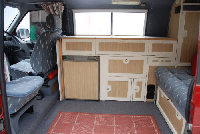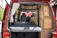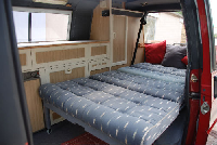 VW Bus Description: 1996 Autohomes Kamper in red. Kitchen including cooker, fridge and sink behind drivers seat. Rear seat converts to bed. Plenty of storage including lockers over cab area. |