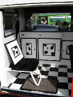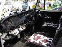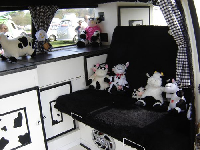 VW Bus Description: This is Daisy, she sleeps 6,cow theme started off with a pair of cow seat covers from my wifes old car, horns i carved from peice of 4"x2" and sprayed. |